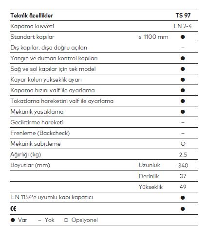 dormakaba TS 97, EN 1154 standartlarına uygun olarak üretilmiştir. Yangın kapılarında ve duman sızdırmaz kapılarda kullanılmaktadır.
